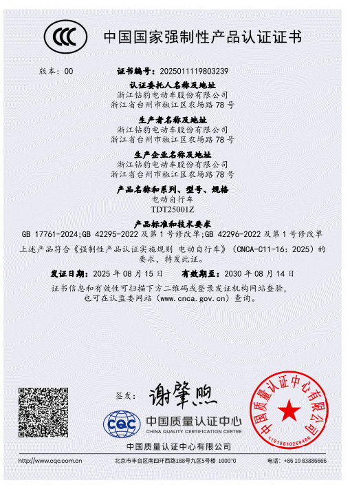 五星钻豹作为新新国标政策的大力推动者,是高质量践行者,更是国家严选品牌,成功入选工信部《电动自行车行业规范条件》白名单的企业之一,并迅速响应新国标3C认证,率先获得GB 17761-2024新国标产品认证证书,获得权威认可,体现出全面领先的实力!